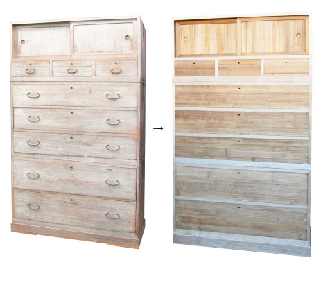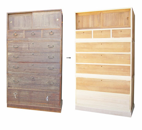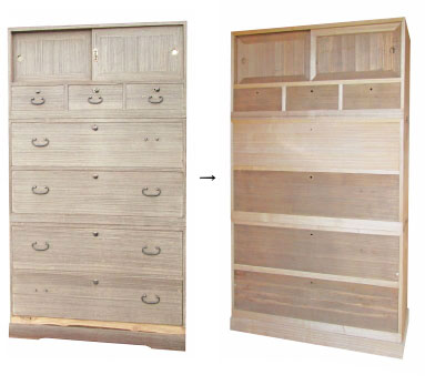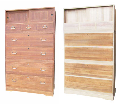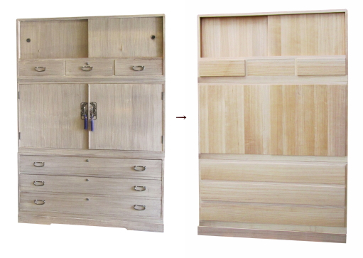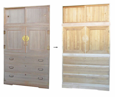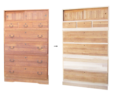 2025年1月21日修理が終わりました。三段に重なっている桐たんすを別置きに仕様変更をしました。引戸部分を虫食いの為、新しく製作して、天板を補強の為、厚みのある桐材を貼り強度をましました。
