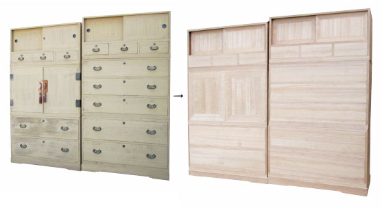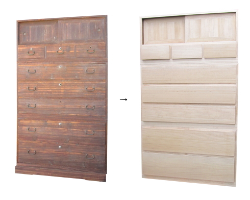 2024年6月24日修理が終わりました。カビが発生した為、桐たんすの修理リフォームのご依頼をいただきました。100℃の熱湯で洗浄後に全体を削りカビを落としました。