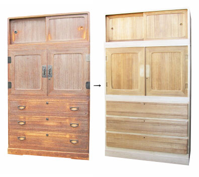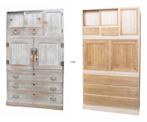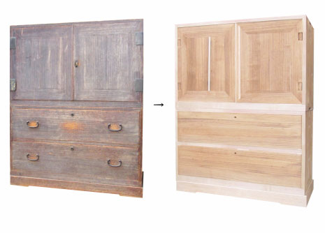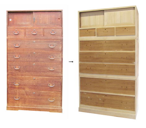 2024年6月10日修理が終わりました。虫食いが多くありましたので、前面の柾板と背板部分を新しい桐材で貼り替え修理をしました。