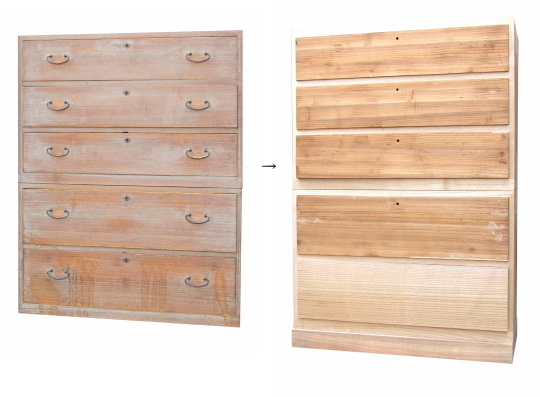 2025年10月12日修理が終わりました。三段に重なっている桐たんすの中台部分を別置きにしたいとのご希望でした。別置きをする中台用に新しく台輪を製作して、上台と下台を重ねて出来るようにリメイク修理しました。