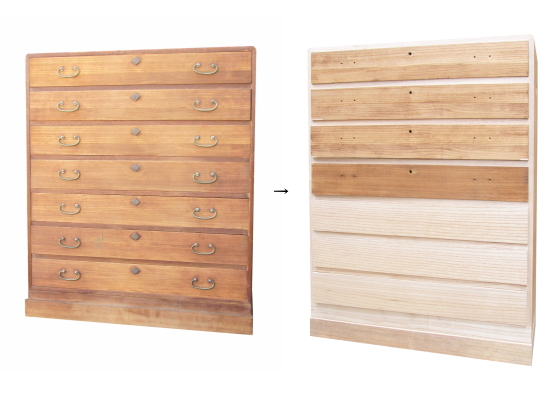 2024年5月7日修理が終わりました。引出しの前面は、桐の無垢板で製作をされている箪笥でした。全体を削り、側面・背板・内部の割れた箇所を修理しました。